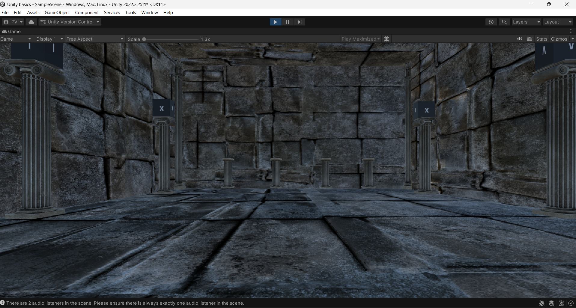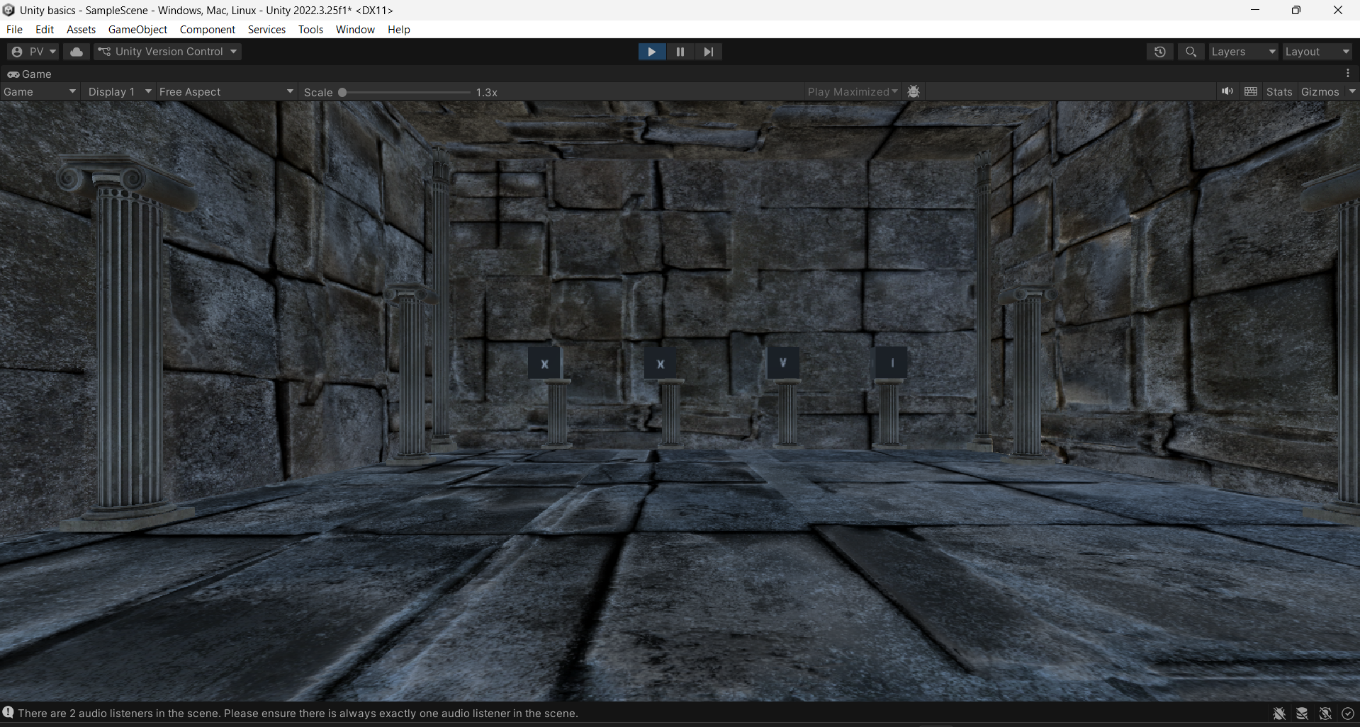 Later on I moved to implement my concept (Treasure Hunt), I started to build Walls, Floor, Ceiling for the first room. I have arranged 4 Tablets (Represents Roman numerals) on 4 different columns. The Player has to collect those tablets and place them on the empty columns (In the intended order) facing towards them. After placing the tablets in correct order, the wall will slide and the Player can able to enter Room 2.